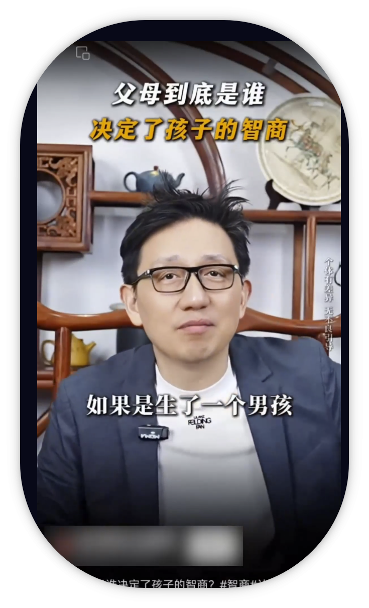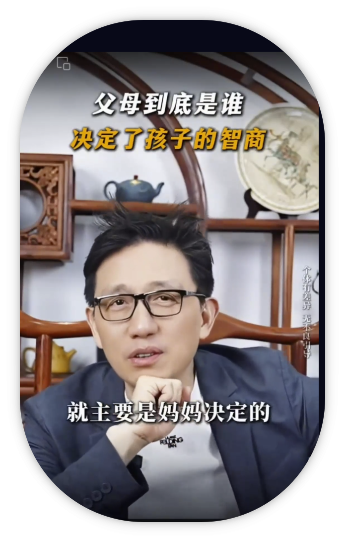 在这段视频中,讲者再次强调了母亲在孩子智商决定中的主要。这种观点在一些讨论中较为常见,尽管有其背景,但仍需要注意以下几点: