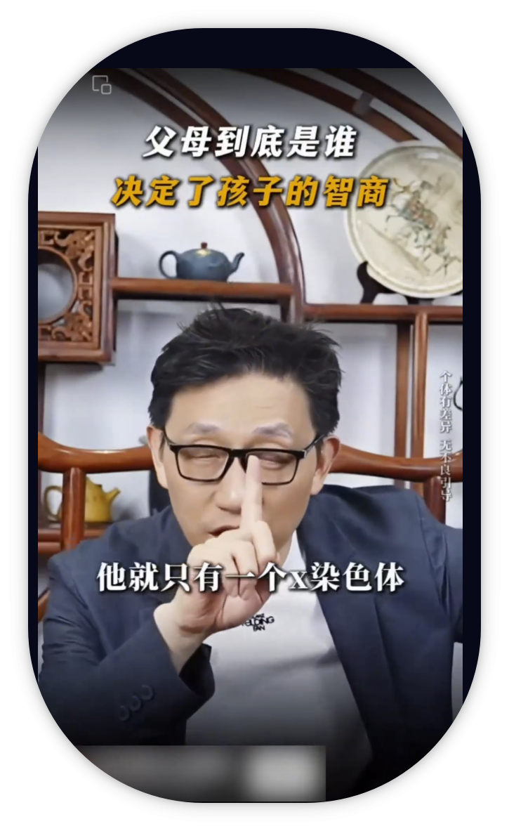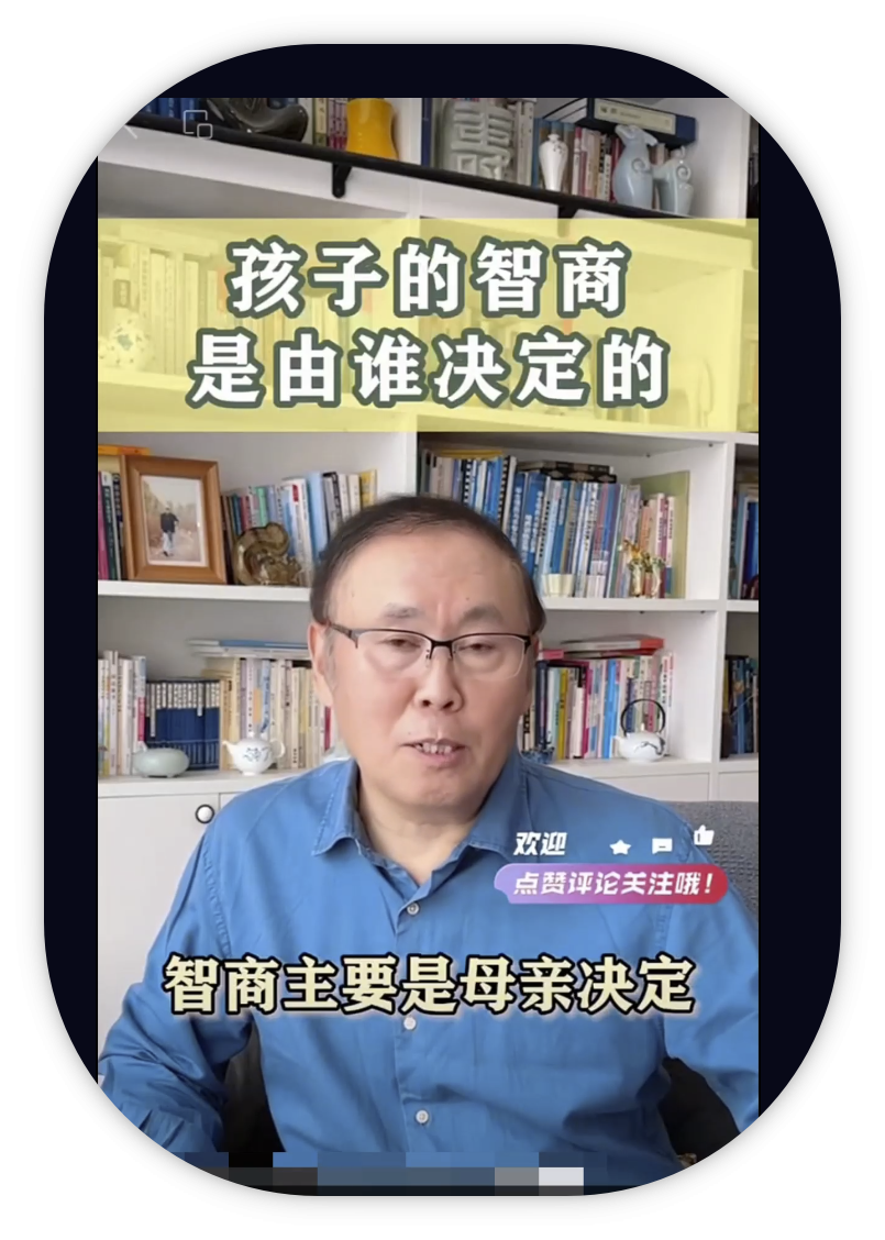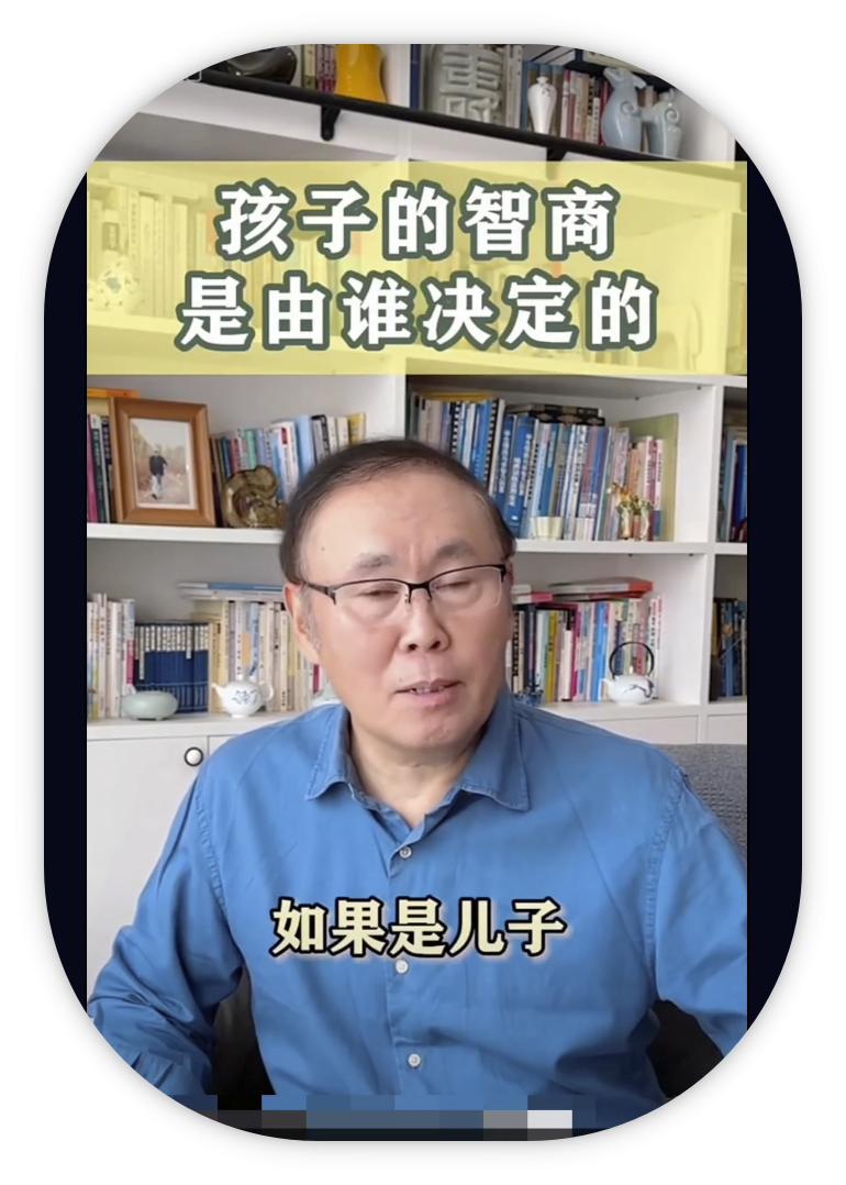 在这段视频中,讲者宣称“儿子的智商是100%来自于母亲”。虽然这种观点引起关注,但仍需考虑以下几点: