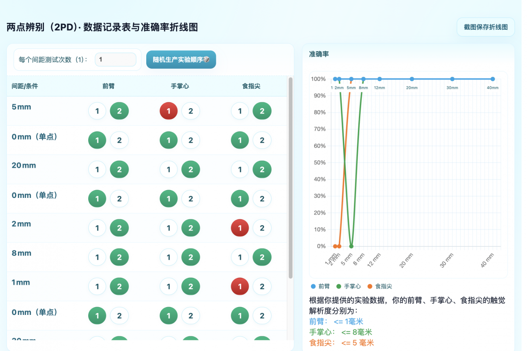 Below I have attached my data, For the first question i think the mininum spacing depends on how much pressure is applied, because in my data for my forearm I got everything correct while on my hand and finger I got some wrong. These results are related to tactile acuity because some parts are more sensitive than others, such as the fingertips. I found the results suprising because I thought I would've done worse on my forearm and better on my finger tips. I think some body parts have better tactile acuity because some places have more touch receptors while others dont.