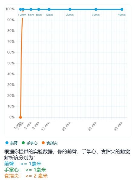 九种不同间距的触感测试做完,在一个点的测试中,能明显观察到指尖的触觉敏感性略低于手心和小臂,同时实验材料 --- 曲别针,顶端的不平整这一情况会导致被测试者判断的不确定性。