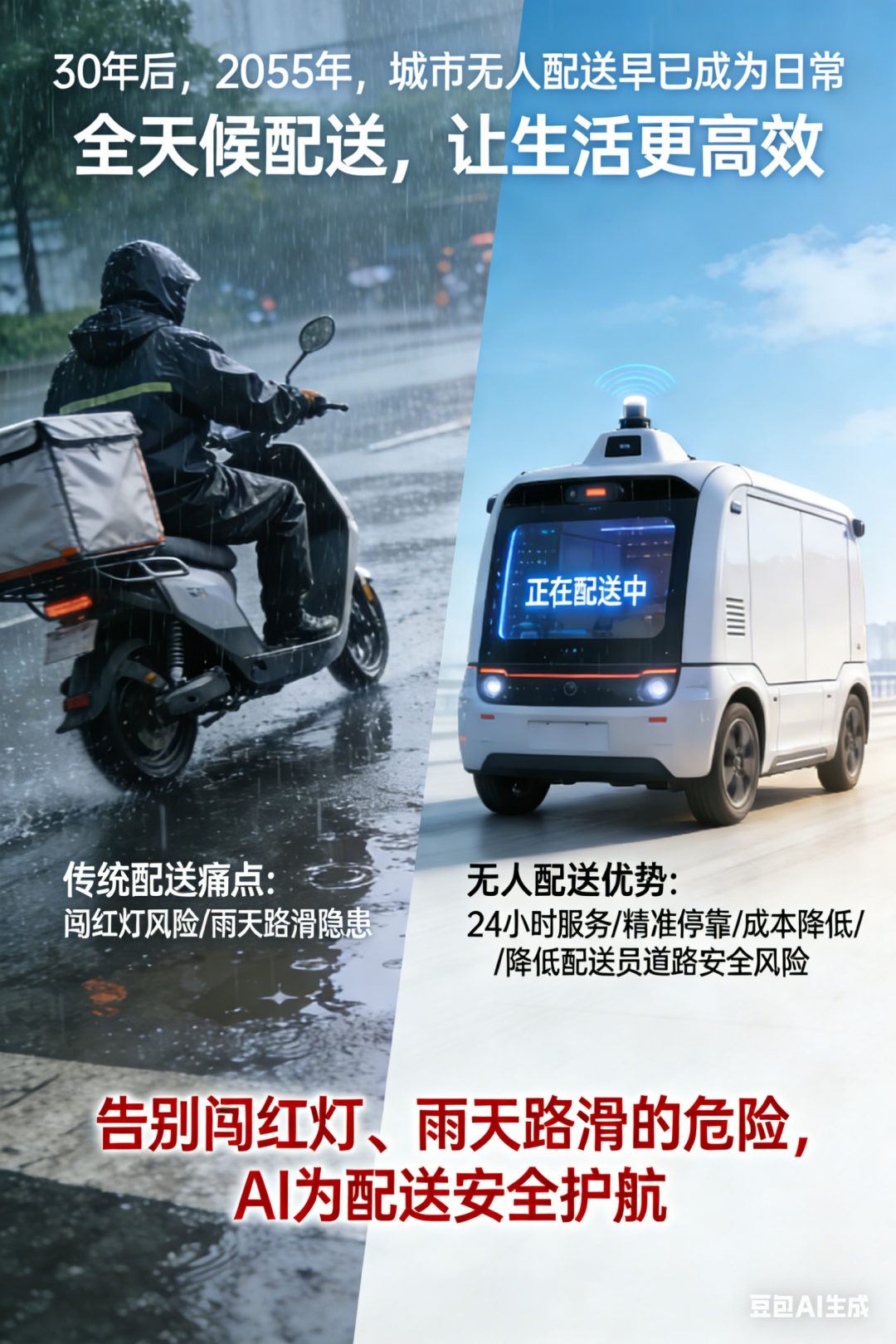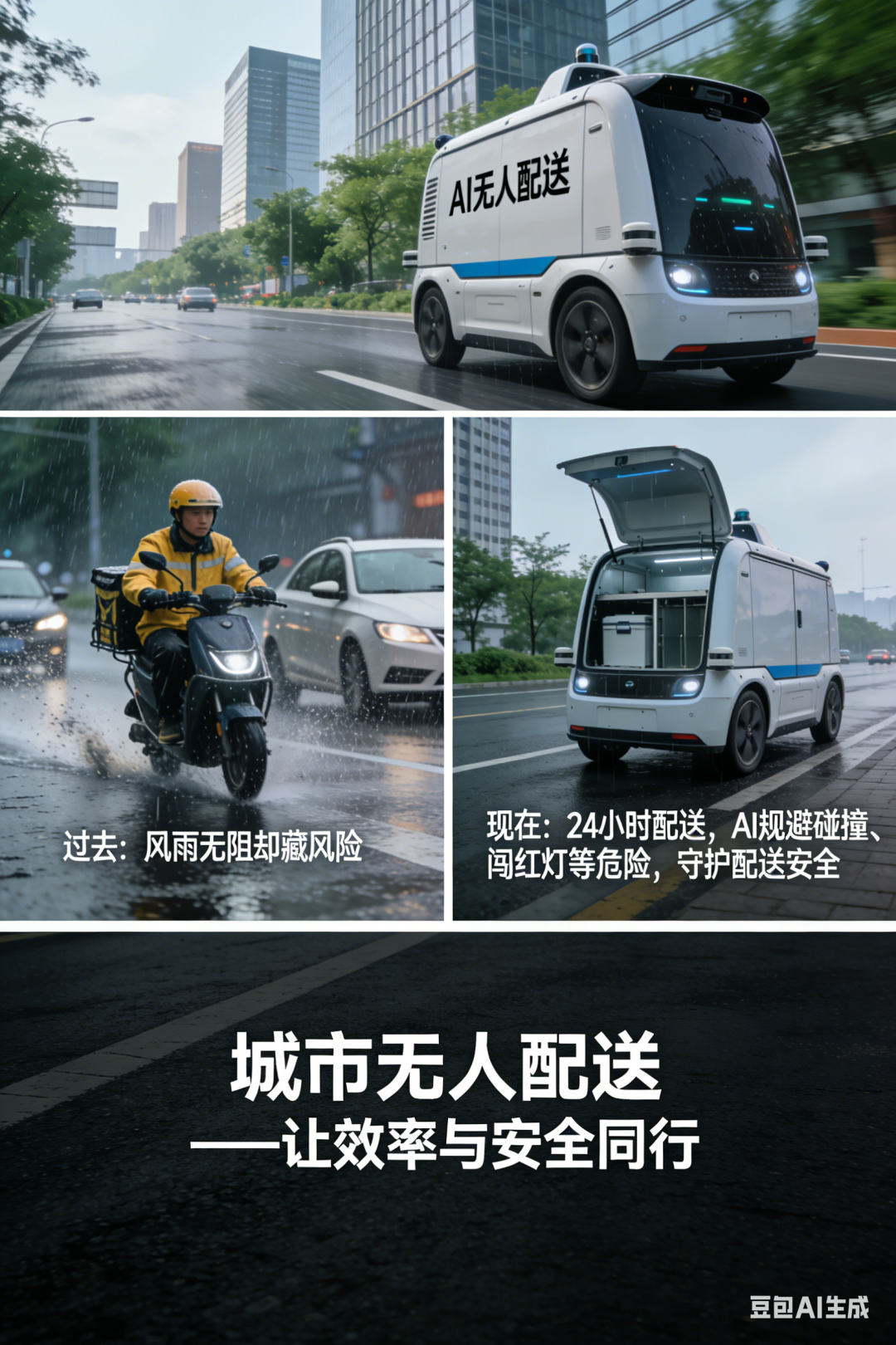 我们选 “城市无人配送” 这个领域。自动驾驶技术会让配送车 24 小时不间断工作,从仓库到小区门口全程自动行驶,避开行人、车辆,精准停靠在收货点。这会让快递、外卖的配送效率大幅提升,尤其是在高峰期或恶劣天气,不用再担心配送延迟。对消费者来说,可能下楼就能在无人配送柜取货,更方便;对企业来说,能减少人力成本,降低配送事故率。海报内容可以突出无人配送车在城市街道穿梭的场景,配上 “全天候配送,让生活更高效” 的标语,再列几个关键改变点,比如 “24 小时服务”“精准停靠”“成本降低”。视频的话,可以拍无人配送车从仓库出发,自动规划路线、避开障碍、完成配送的全过程,再采访一下用户和企业的感受。