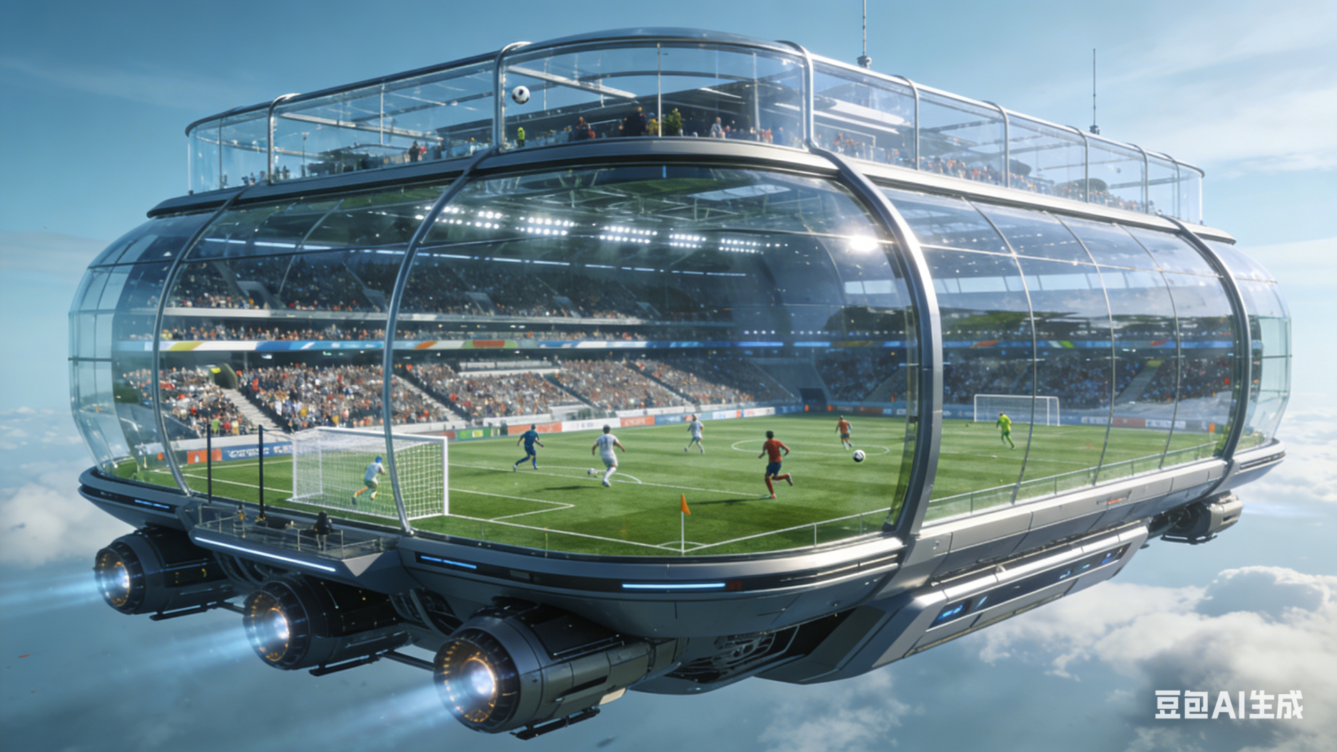 外围采用钢化玻璃,上有观景台,球迷商店,内置强力通风机,采用稳定的发动机,事故率0%,座位上有爱心AI1对1的服务,可以召唤爱心机器人服务,送餐,全免费,门票3888RMB,现在有8.8折优惠,还送主队围巾。