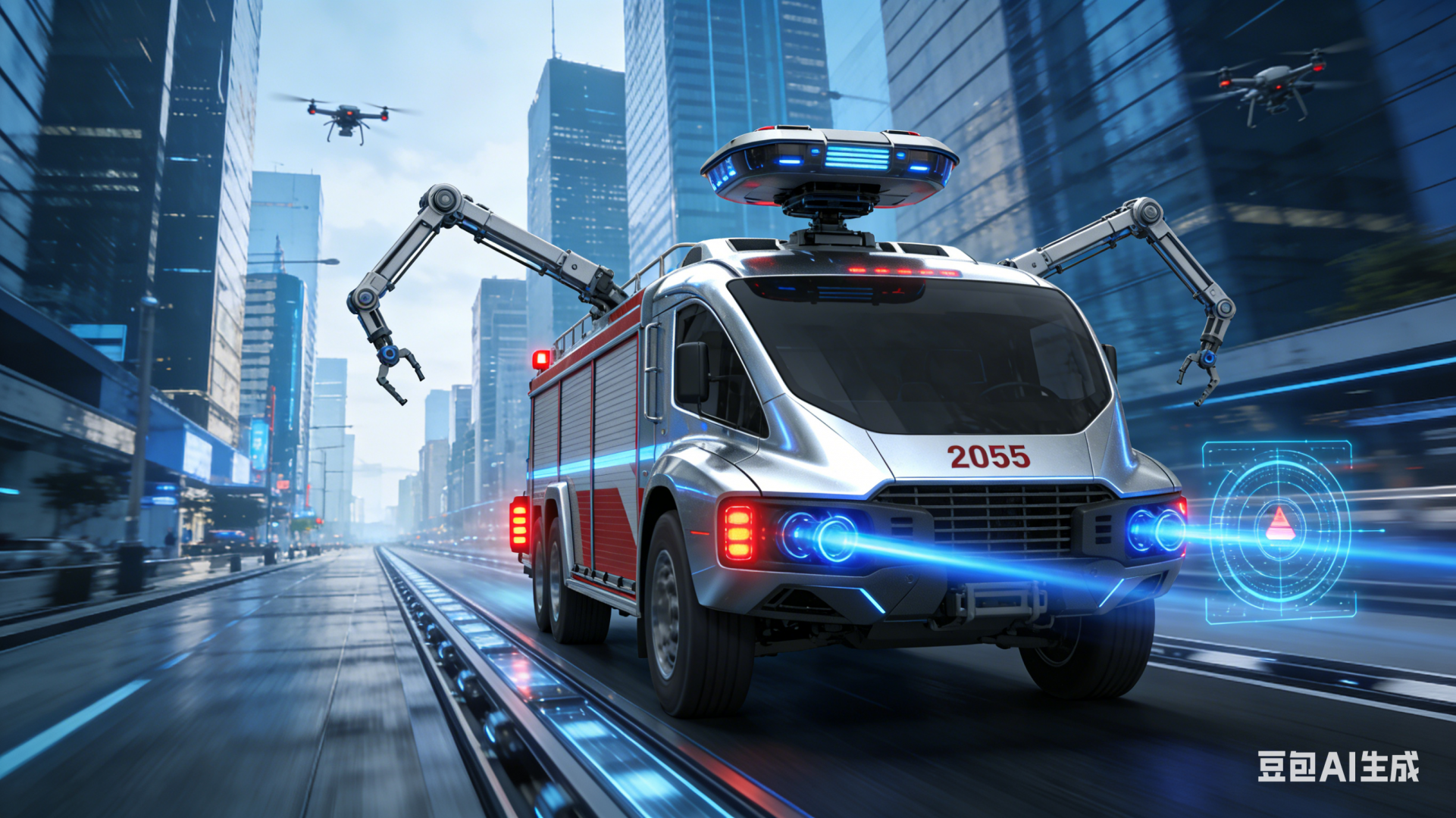 这辆车有两个机械臂可以帮忙把前面的障碍给扫清,还有一个3D投影可以让我们时时看清路况,看清有没有堵车,还有灭火无人机可以率先飞到楼顶去扑灭火源。